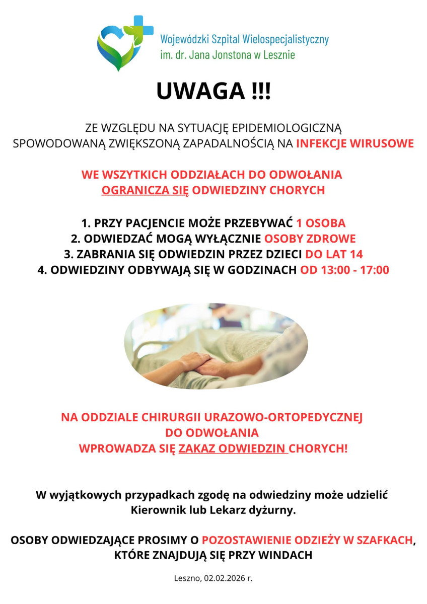 W związku ze zwiększoną zachorowalnością na infekcje wirusowe Wojewódzki Szpital Wielospecjalistyczny w Lesznie ogranicza odwiedziny.