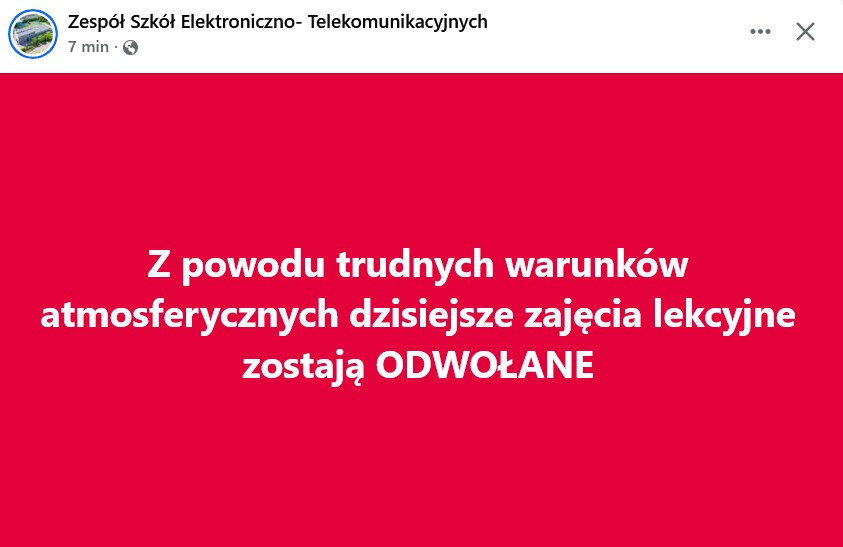 "W dniu dzisiejszym zajęcia w szkole odwołane, jednocześnie Dyrektor informuje że dzieci które nie będą miały opieki będą miały zapewniona opiekę".