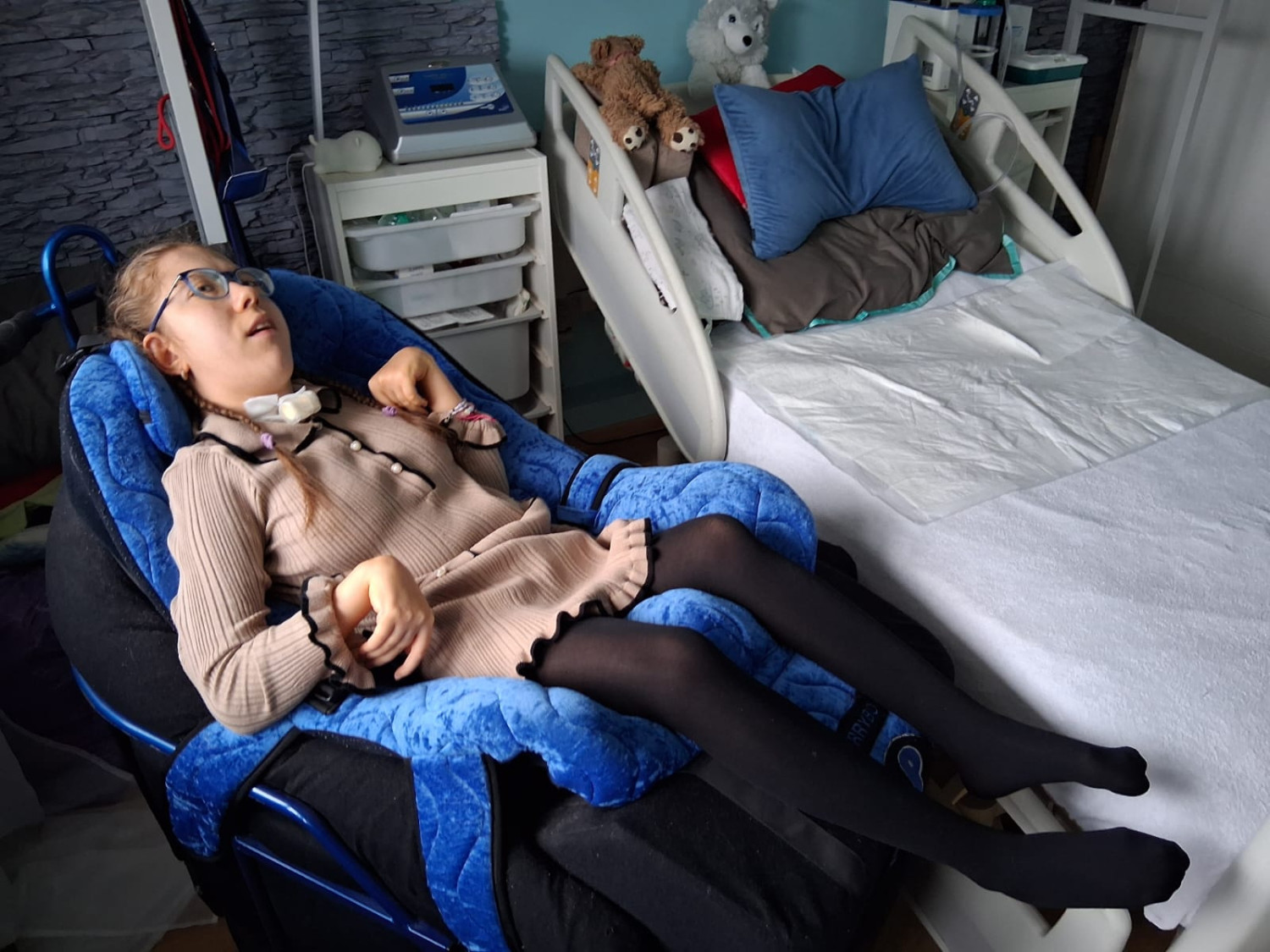 W niewielkim mieszkaniu zajmuje największy pokój. Ma odpowiednie łóżko, odpowiedni wózek, na suficie podwieszona jest szyna transportera, Zuzię najpierw trzeba położyć na specjalnej macie, przypiąć linki i już może "wędrować".