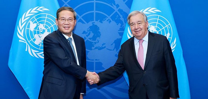 24 września czasu lokalnego premier Chin Li Qiang spotkał się z sekretarzem generalnym ONZ António Guterresem w Nowym Jorku. Li Qiang wyraził, że strona chińska jest gotowa współpracować z ONZ oraz innymi stronami w celu wzmocnienia komunikacji i koordynacji, aby wspólnie realizować globalne inicjatywy w zakresie zarządzania, promować budowę bardziej sprawiedliwego i rozsądnego systemu zarządzania globalnego oraz przyczynić się do większego pokoju i rozwoju na świecie.