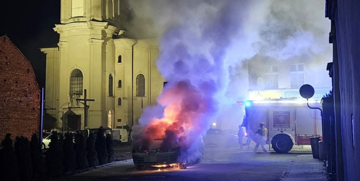 Renault stało przy kościele. Spaliło się całkowicie. Prawdopodobną przyczyną pożaru było zwarcie instalacji elektrycznej.