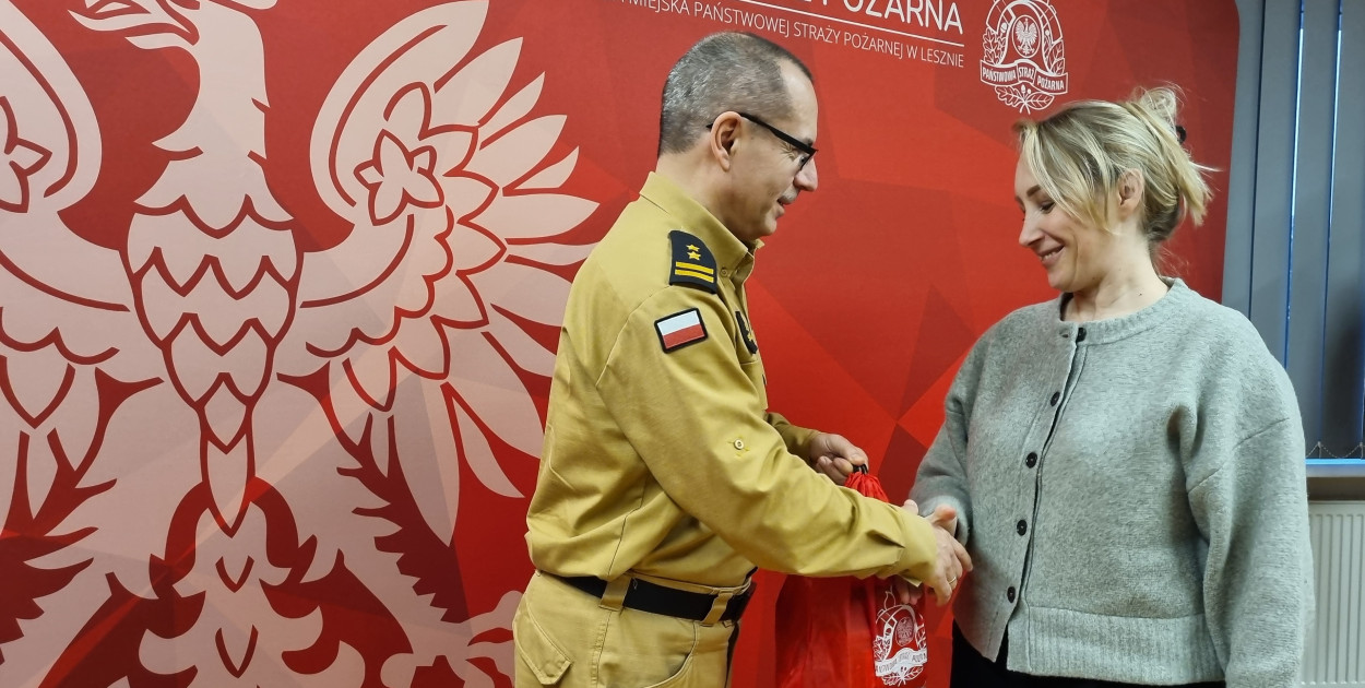Plecaki z upominkami ufundowanymi przez Komendę Miejską Państwowej Straży Pożarnej, miasto Leszno i powiat leszczyński, odebrali laureaci konkursu o bezpieczeństwie.