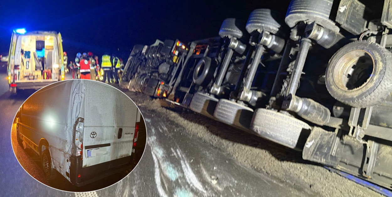 Do tego wypadku doszło w środę 14 stycznia po godz. 18 na wysokości Smyczyny w kierunku Poznania. Ciągnik siodłowy Scania z naczepą z Macedonii Północnej, przewożący 18 ton liści tytoniu, zahaczył o lewy tył Toyoty Proace Max stojącej na pasie awaryjnym. Kierowca tira nie opanował pojazdu, odbił w lewo, następnie w prawo i wjechał do rowu, gdzie zestaw przewrócił się na bok. Naczepa Scanii była zaplombowana, ładunek z niej nie wypadł.