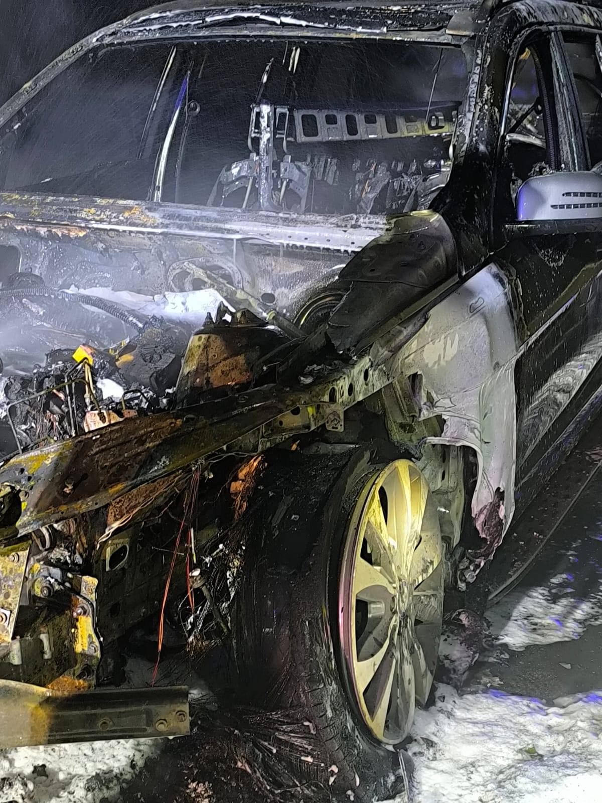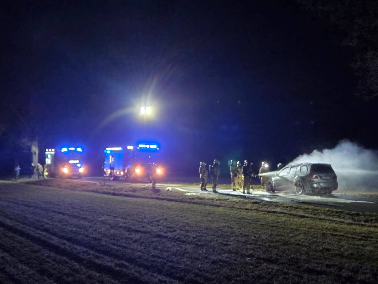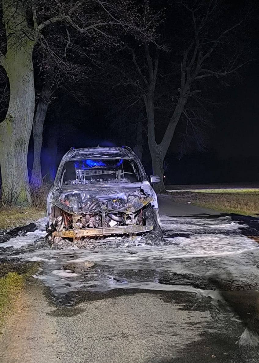 Samochód zaczął płonąć podczas jazdy i spalił się całkowicie. Kierowca zdążył wysiąść i nie odniósł żadnych obrażeń.