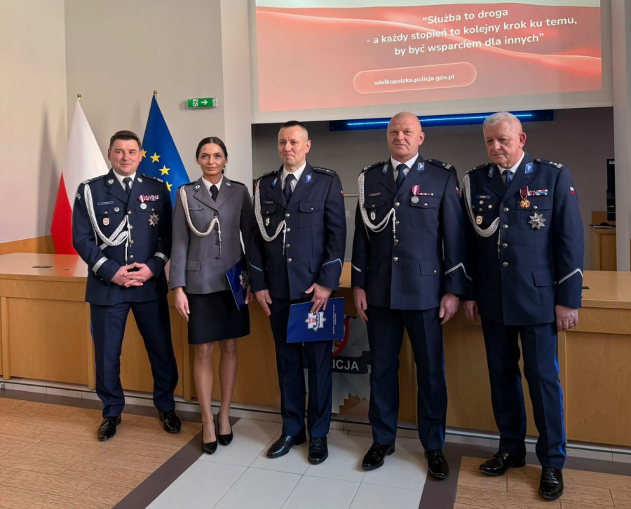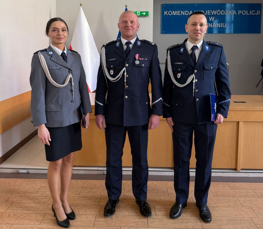 Awanse na stopień młodszego aspiranta funkcjonariusze odebrali w Komendzie Wojewódzkiej Policji w Poznaniu z rąk nadinspektora Tomasza Olczyka.
