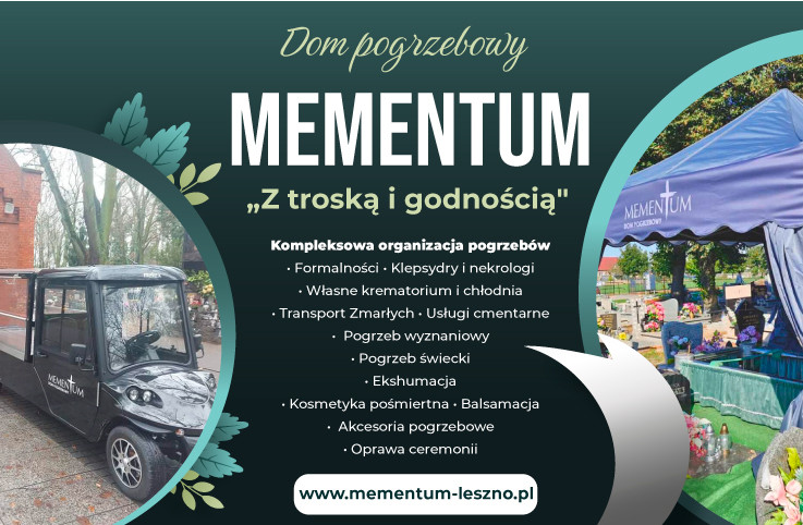 Mementum oferuje szeroki wybór trumien oraz urn i może w tej kwestii spełnić każdą ostatnią wolę rodziny, czy samego zmarłego, jeśli wyraził ją przed swoim odejściem. Zdarzają się wyjątkowe życzenia np. dotyczące kształtu urny, nawiązującego do pasji, zawodu, czy stylu życia odchodzącej osoby. Coraz częściej prochy chowane są w urnach biodegradowalnych, które szybko i łatwo rozkładają się w ziemi. Trumny, urny, krzyże czy tabliczki można wybrać w biurze domu w Lesznie.