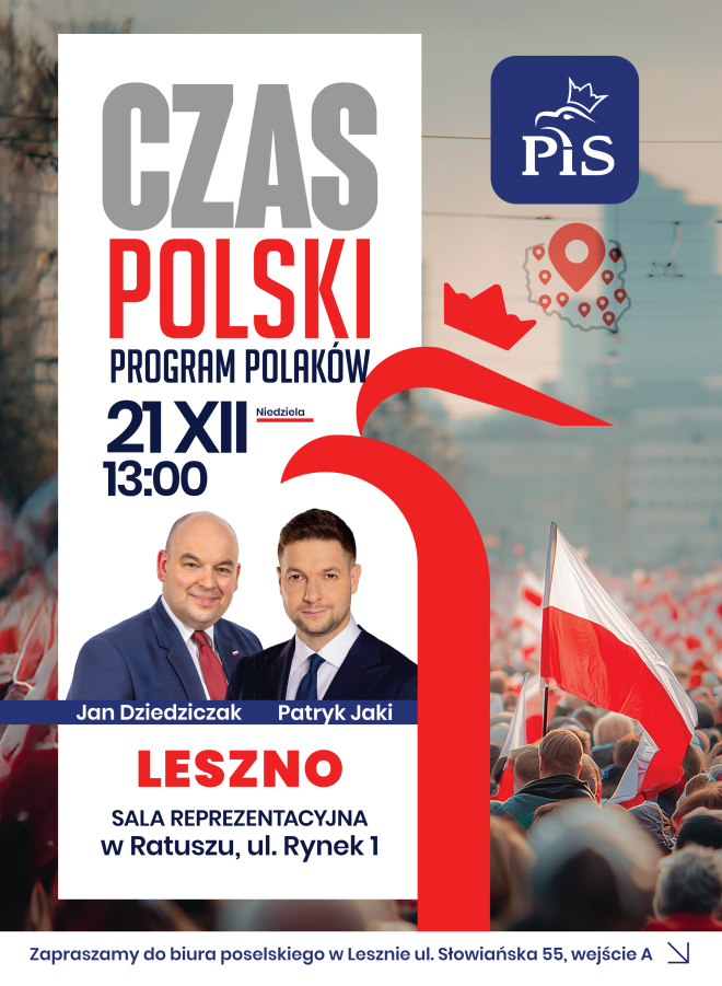 W niedzielę, 21 grudnia do Leszna przyjedzie Patryk Jaki, europoseł Prawa i Sprawiedliwości. Na spotkanie z nim zaprasza poseł Jan Dziedziczak. Spotkanie będzie otwarte dla wszystkich zainteresowanych i rozpocznie się o godz. 13 w sali ratusza. Potrwa około godziny.