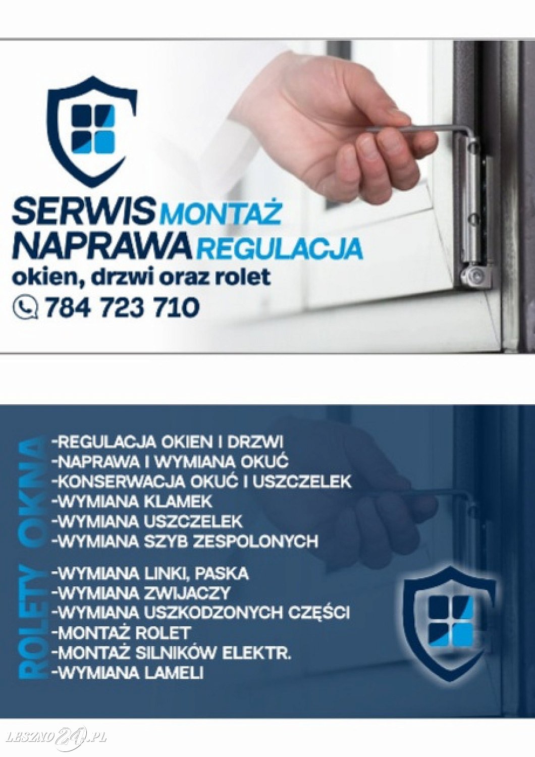 Tel. 784723710 Zajmuje się pogwarancyjnym serwisem, naprawą i regulacją okien, drzwi balkonowych, drzwi zewnętrznych PCV oraz rolet zewnętrznych. Okno przyciera o ościeżnicę? Klamka ciężko się zamyka? Wieje mimo zamkniętego okna? Roleta nie opuszcza się do końca lub nie można jej podnieść? To znak że potrzebna jest regulacja lub naprawa!! Zakres usług: -regulacja okien i drzwi - naprawa i wymiana okuć - konserwacja okuć i uszczelek - wymiana klamek - wymiana uszczelek - wymiana szyb zespolonych Naprawa rolet zewnętrznych - wymiana linki, paska - wymiana zwijaczy - wymiana uszkodzonych części - montaż silników elek. -wymiana lameli Montaż -okien - drzwi zewnętrznych -drzwi wewnętrznych -rolet zewnętrznych -parapetów Obróbka okien i drzwi. Zapraszam do skorzystania z usług!!! Tel. 784723710